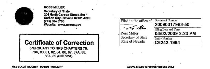 CERTIFICATE OF CORRECTION OF