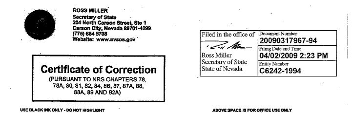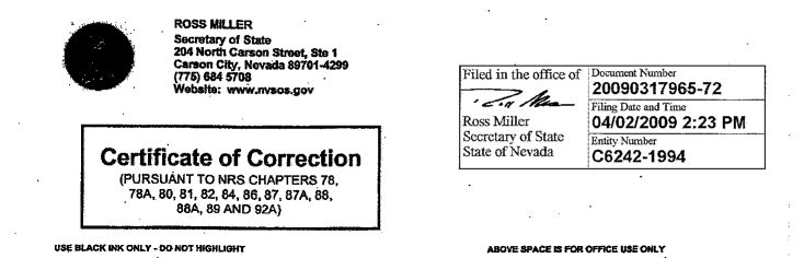 FILED BY THE NEVADA SECRETARY OF STATE ON AUGUST 10, 2007